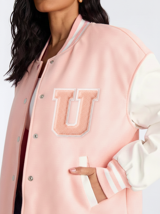 Baby Pink Varsity Jacket- U Patch
